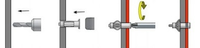 Tyto hmoždinky vyžadují ke své aplikaci montážní kleště, pomocí kterých se za kotveným materiálem smrští a zajistí. Průměr vhodného vrtáku je roven průměru kotvy.