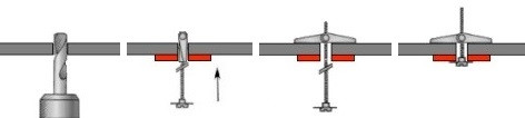 Pomocí vrtáku o průměru udávaném níže vyvrtejte otvor a protáhněte jím kotvu přes kotvený materiál. Hmoždinka se po vsunutí do otvoru samočinně sklopí a ukotví a integrovaná velkoplošná podložka perfektně zakryje vyvrtaný otvor.