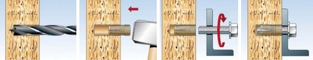 Kotvy PA 4 jsou vhodné pro předsazenou montáž. Při šroubovávání metrického šroubu se mosazná hmoždinka rozpírá v přední části a spolehlivě kotví do podkladu. Výpočet minimální délky šroubu při montáži hmoždinky v líci podkladu se vypočítá jako délka hmoždinky + tloušťka kotveného dílu. Průměr vhodného vrtáku je roven průměru hmoždinky.