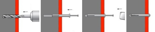 Vyvrtejte otvor (průměr vhodného vrtáku je roven průměru hmoždinky), hmoždinku provlečte skrz kotvený díl a zatlučte hřeb.