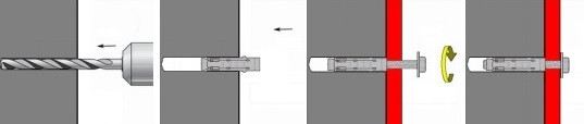 Kotvy KOS s vnitřním závitem jsou vhodné pro předsazenou montáž. Vyvrtejte otvor (průměr vhodného vrtáku je roven průměru kotvy) o příslušném průměru a zasuňte do něj kotvu. Utahováním šroubu se kotva zajistí v materiálu.