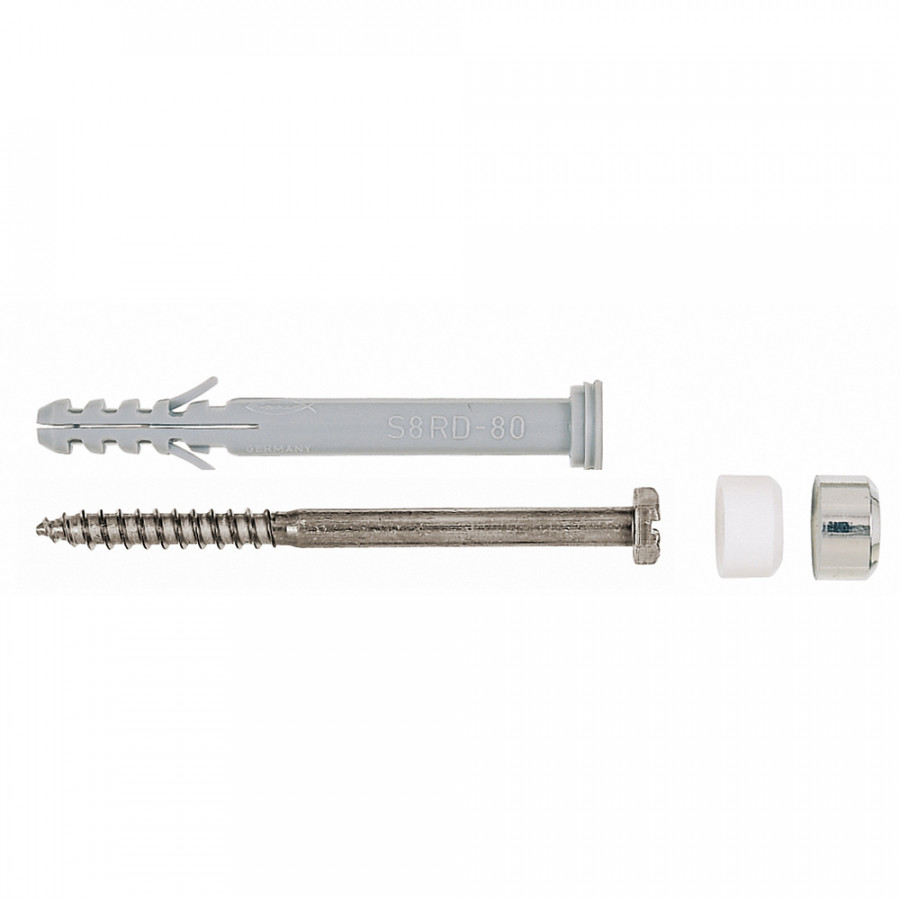 Sada obsahující dvě hmoždinky o průměru 8 mm, odpovídající mosazné vruty a bílé a chromované krytky pro rychlou a snadnou montáž volně stojících toalet a bidetů.