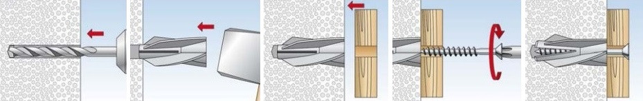 Hmoždinky GB jsou vhodné pro předsazenou montáž. Spirálovitá vnější žebra zajišťují tvarové spojení mezi stavebním materiálem a hmoždinkou. Otvor vyvrtejte rotačním vrtáním bez příklepu. Požadovanou délku vrutu vypočítáte jako délku hmoždinky + tloušťku kotveného dílu + průměr vrutu. Průměr vhodného vrtáku je roven uváděnému průměru jádra hmoždinky. Lze aplikovat i v pórobetonu bez omítky.