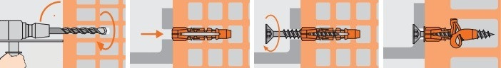 Hmoždinky MU jsou vhodné pro předsazenou montáž, a to jak při vnitřní tak venkovní aplikaci. Požadovaná délka vrutu se počítá jako délka hmoždinky + síla kotveného dílu + průměr vrutu. Průměr vhodného vrtáku je roven průměru hmoždinky.