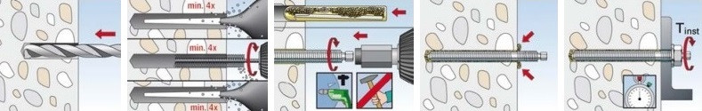 Kotevní svorníky RGM tvoří společně s chemickými patronami R osvědčený kotevní systém. Kotevní šroub RGM se osazuje rotačním příklepem pomocí vrtacího kladiva a příslušného osazovacího nástroje. Při montáži hrana kotevního svorníku rozbije patronu uvnitř vyvrtané díry a její obsah se smísí a aktivuje. Pryskyřice celoplošně přilepí kotevní šroub ke stěně otvoru a zároveň otvor utěsní.