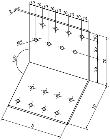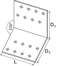 Statický úhelník s otvory a úhlem ohybu 135°, vyrobený z ocelového pozinkovaného plechu o síle 2 mm.