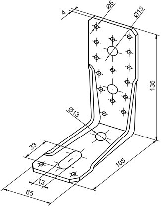 Statický kotevní prvek s otvory, vyrobený z ocelového pozinkovaného plechu o síle 4 mm.