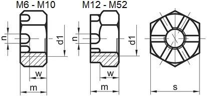 | Průměr (d) | Rozměr klíče (s) | Výška matice (w) | Celková výška (m) | Rozteč korunky (n) |