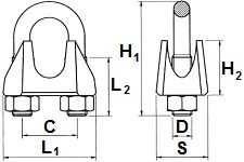 | Vhodné lano | Výška (H1) | Šířka (L1) | Výška těla (H2) | Síla těla (S) | Průměr šroubů (D) | Rozteč šroubů (C) | Délka šroubů (L2) |