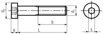| Průměr (d1) | Rozměr drážky (s) | Průměr hlavy (d2) | Výška hlavy (k) | Závit (b pro L ≤ 125) | Závit (b pro 125 < L ≤ 200) | Závit (b pro L > 200) |