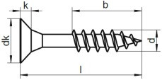 | Celková délka (l) | Délka závitu (b) | Průměr (d) | Průměr hlavy (dk) | Výška hlavy (k) | Drážka | |